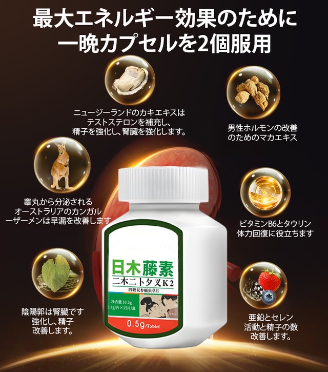 4分鐘前【日本進口】男士補充品:立即體驗不知疲倦的耐力!男性向けサプリメント ,疲れ知らずのスタミナを実感、今すぐ体験! - 【重燃自信 增時增硬 體驗強悍真男人!】1盒裝NT$1099